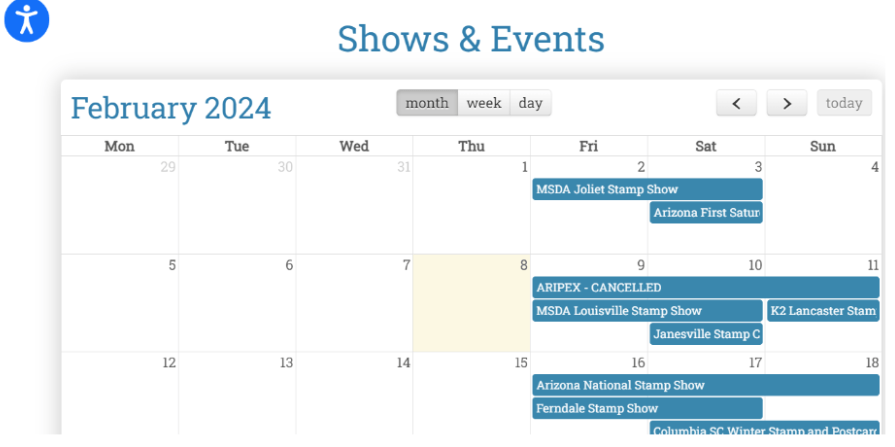 I was looking around the American Philately Society (APS) website and decided to check out their Events Calendar. The APS Events Calendar (https://stamps.org/events/events-calendar) can be displayed by month, week, day.